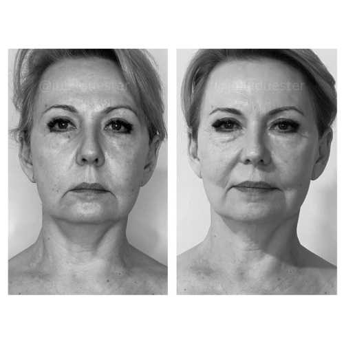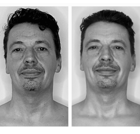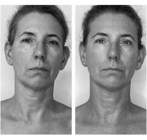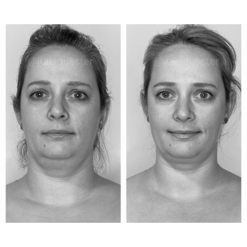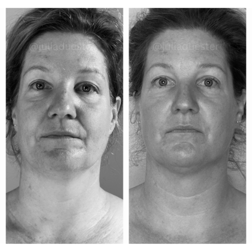 "Die rein optischen Veränderungen sind nach unserem dritten Termin wirklich enorm: Schwellungen sind stark reduziert und die beiden Gesichtshälften deutlich symmetrischer. Dass die positiven Veränderungen im Gesicht nicht aufhören, sondern sich auch an Hals, Schlüsselbein und Oberkörper offenbaren, zeigt wie unfassbar effektiv und nachhaltig das Ganze ist. Viel krasser als die Optik, ist aber mein Empfinden der Gesichtsmuskulatur. Das erste Mal seit Jahren (!!!) ist diese weich und nicht hart angespannt. Also heute war für mich ein echter Gamechanger. Wenn das so weitergeht bin ich echt im Glück! Diese neue "Weichheit" ist wirklich wunderbar. Kannte ich schon gar nicht mehr, dieses Gefühl. Vielen lieben Dank! Du hast echte Wunderhände!"